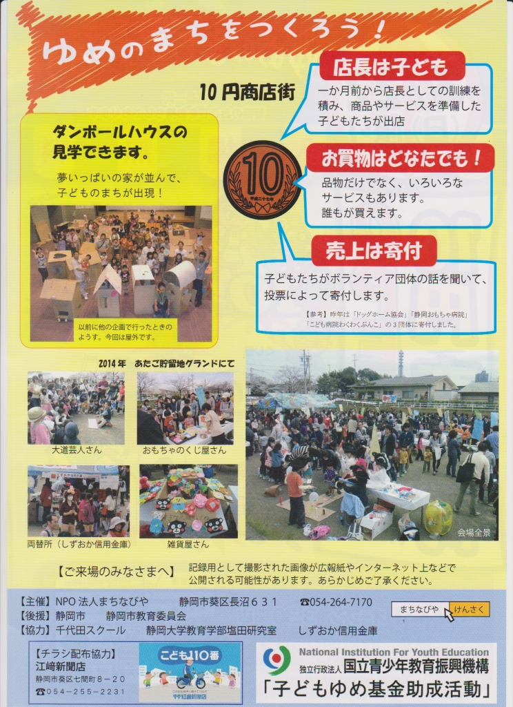 大好評の10円商店街、今年もこども店長募集を始めました。原則として小学1~6年生対象。1チーム1人~3人程度でお店を出します。商品・サービスはすべて10円均一。売り上げは、子どもの投票により、地元の複数のボランティア団体に寄付されます。参加費一人500円(全4回、保険代込み)。